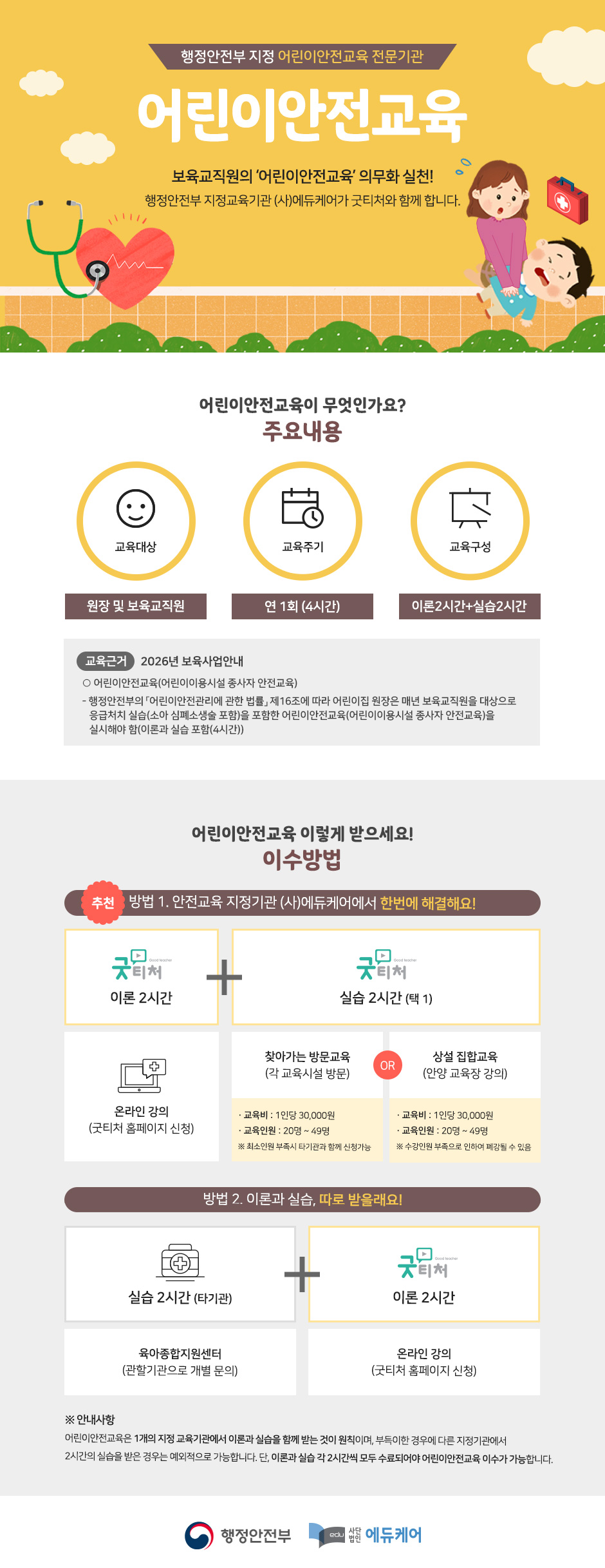 강의내용 및 특징 「어린이안전관리에 관한 법률 시행령 」제9조에 의거하여 어린이이용시설 관리주체는 매년 응급처치 실습 등을 포함한 안전교육을 실시해야 합니다. 동법 제3항에 의거하여 응급상황 행동요령, 주요 내ㆍ외과적 응급처치 이론, 소아심폐소생술을 포함한 응급처치 실습교육으로 강의를 구성했습니다.
